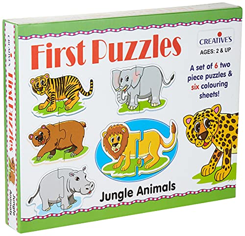 “First Puzzles-Jungle Animals” by Creative’s is a set of 6 shaped puzzles each with two pieces. The child is required to identify and match the correct pairs of pieces that depict some common animals that live in the jungle. Six colouring sheets of the same animals have also been provided with the game to bring out creativity in the children along with improving their hand-eye coordination and concentration skills.