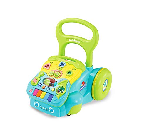 Baby learning walker with multifuntional educational toy with interactive learning walker features a removable play panel. Interactive learning walker features a removable play panel. 5 piano keys play musical notes and encourage creativity. Spinning gears, 2 rattles, and 3 light-up buttons develop motor skills.