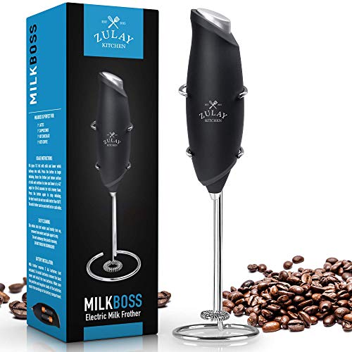 Enjoy a cappuccino, macchiato or latte at home, every day, and save $Money$ with the Milk Boss electric battery operated milk frother.Why spend your hard earned dollars in the coffee shop when our premium milk frother makes amazing foamy, frothy beverages in the comfort of your home?The MilkBoss is a powerful handheld battery powered rapid mixer milk frother.Use hot or cold milk. For hot beverages, just microwave the milk or heat up quickly in a pan.Easy to Use Just take it off the stand, put it in the milk, press the button and move up for 15-30 seconds. It’s made to fit very comfortably in your hand, almost like a pen. Includes an easy one touch push button. You will need 2 AA batteries which are not included with the mini mixer.Many Uses This high powered milk frother whisk is strong enough to milk various liquids including: frothing milk for coffee, lattes, cappuccinos, hot chocolate, cocktails, milk shakes, protein shakes, bullet proof coffee, almond milk, chia latte, matcha teas, mixing eggs, breaking up clumps in sauces, etc. You will be able to use this electric milk frother and matcha whisk all the time without having to worry about it breaking on you (compare to Jura).Easy CleanSimply submerge the whisk in a cup of warm water, hit the button, and it’s clean in seconds!Lifetime Money Back Guarantee We believe in our product so much that if for any reason you are not fully satisfied, just return your Milk Frother and we will give you a full refund, no questions asked. Your frother is guaranteed to last for years, if not you can message us directly and we will make it right, as we do every time someone reaches out.What’s In The Box: 1. Milk Frother 2. Stainless Steel Stand 3. Your Kitchen Happiness Team Contact Card (Two AA Batteries NOT Included)