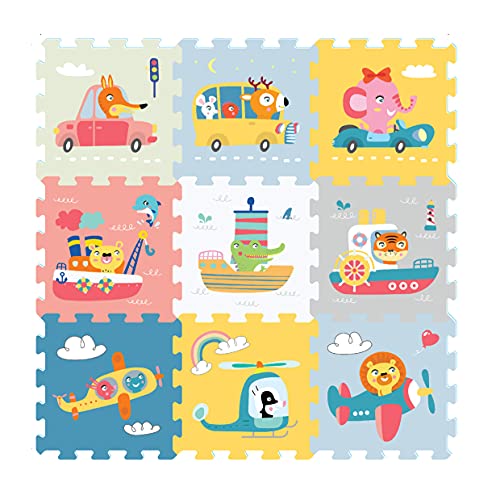 Sunta Transportation & Animals Baby Puzzle Mat can be used to identify animals, patterns, and different transportation for your child’s early education. It helps kids to develop cognitive function, motor skills, hand-eye coordination, visually stimulating, logic during playtime. Colourful, easy to assemble and thick, the mat interlocks together like a giant jigsaw puzzle to create a fun and educational play area. Made from premium EVA foam. Apart from adding colour to your room, you can use it as a mat to leave your child on it to play. Perfect for keeping your child engaged for hours. This is an interlocking 9-piece puzzle mat.